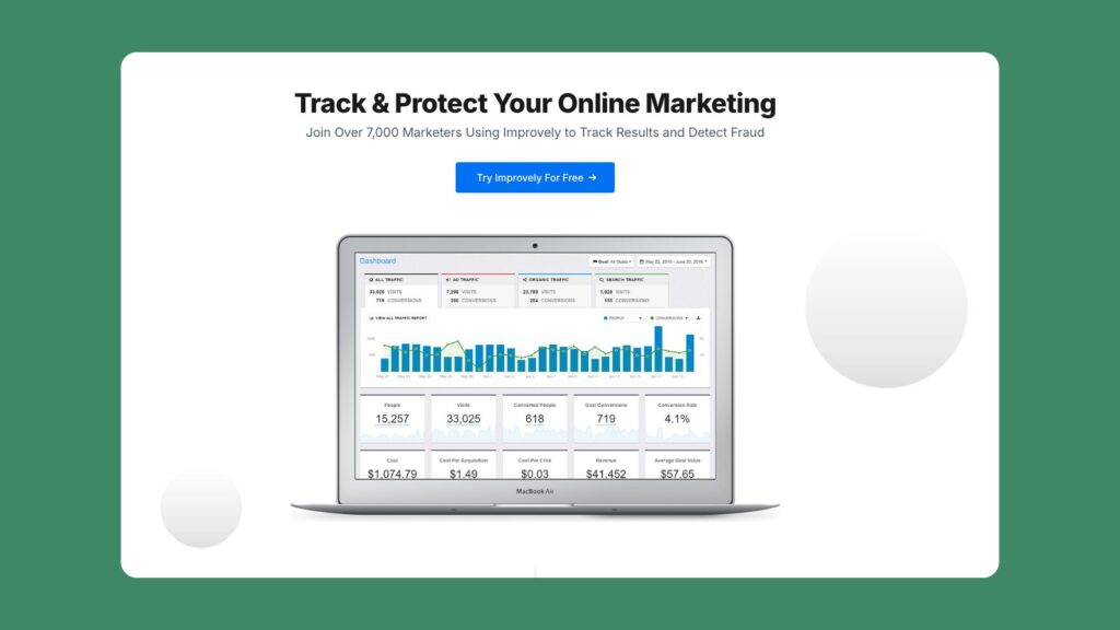 Improvely is a link-tracking service and analytics tool built around conversion tracking and fraud detection, enabling you to analyze traffic sources. It’s well-suited for freelancers, small agencies, and marketing teams that want to see which clicks turned into sales.