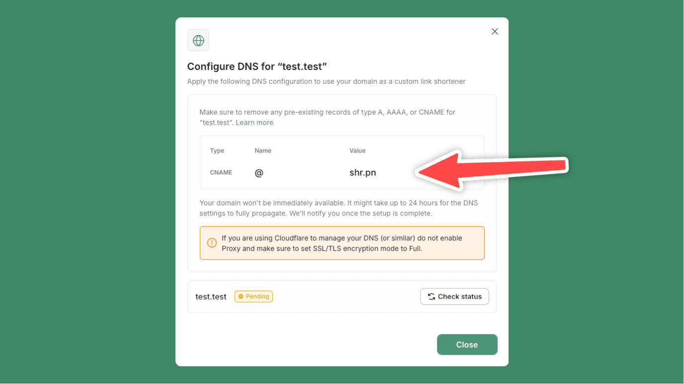 Your shortener will tell you exactly which record type to add and what values to use. For a subdomain like go.yourbrand.com, this is usually a CNAME plus a TXT verification record.