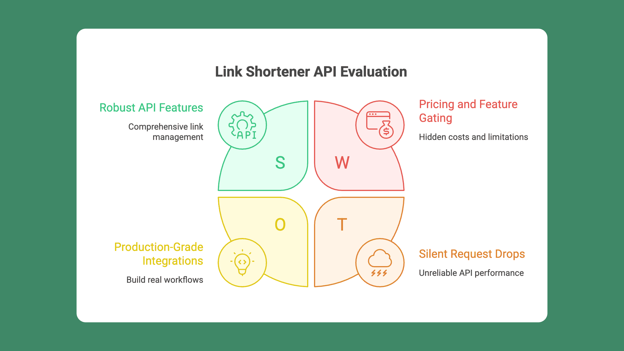 Most tool comparisons only mention "create and manage links." The depth of the API determines whether you can build real workflows or just shorten URLs. For a focused comparison of API providers, see our guide to choosing a URL shortening API.